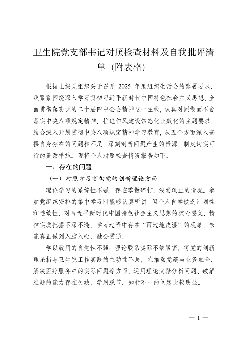 卫生院党支部书记对照检查材料及自我批评清单(附表格)
