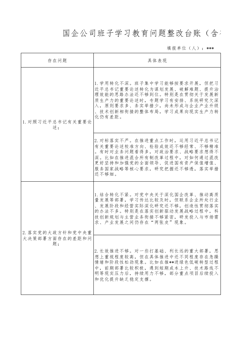 国企公司班子学习教育问题整改台账(含存在问题、具体表现、整改措施、进展成效)