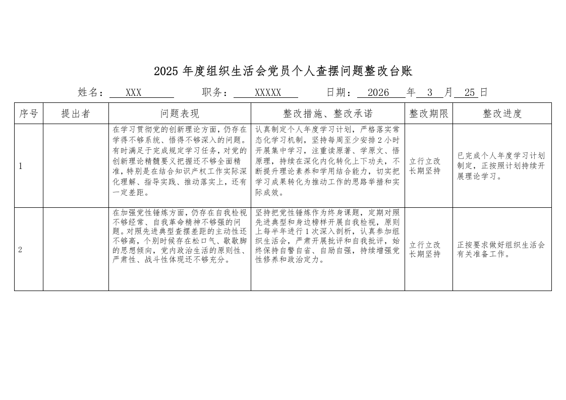 2025年度组织生活会个人问题整改台账