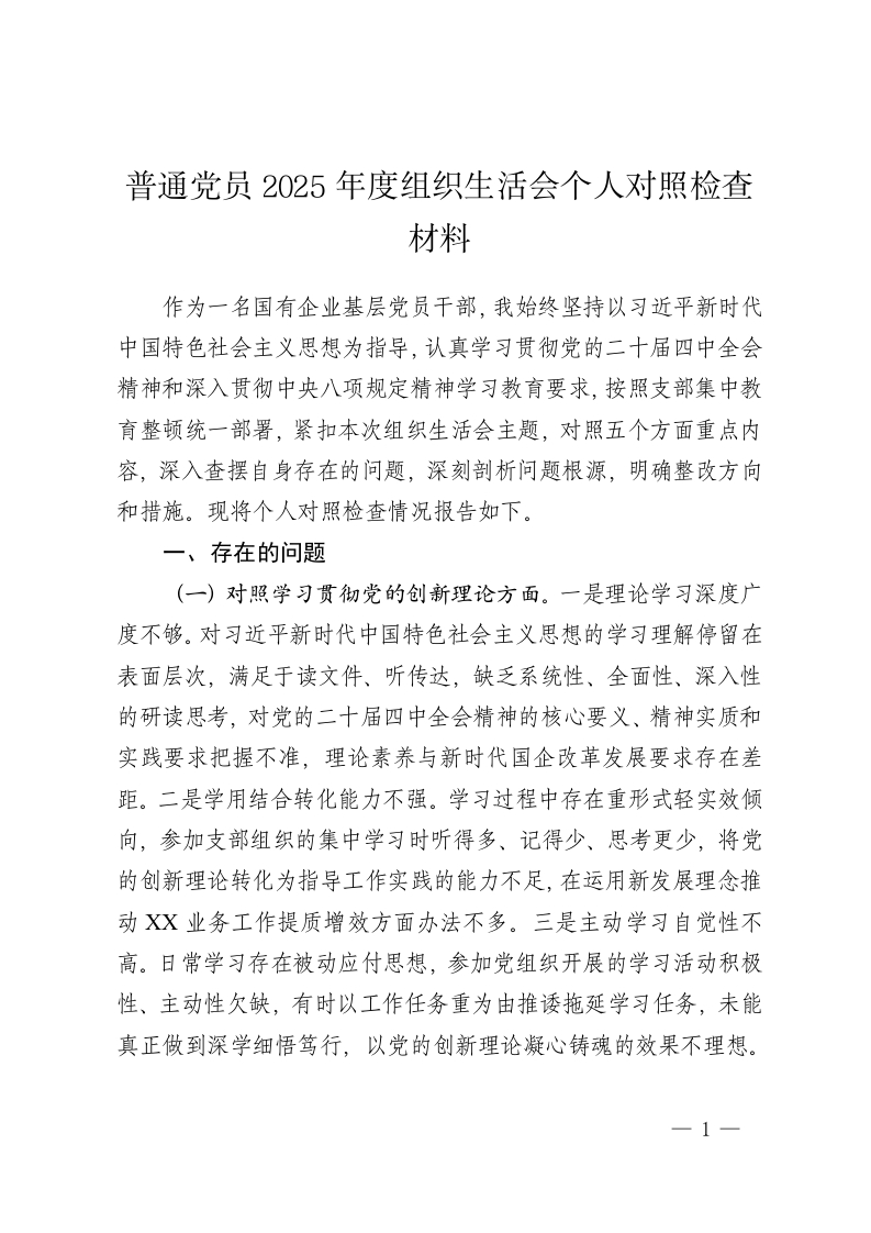 普通党员2025年度组织生活会个人对照检查材料作为一名国有企业基层党员干部,我始终坚持以习近平新时代中国特色社会主义思想为指导,认真学习贯彻党的二十届四中全会精神和深入贯彻中央八项规定精神学习教育要求,按照支部集中教育整顿统一部署,紧扣本次组织生活会主题,对照五个方面重点内容,深入查摆自身存在的问题,深刻剖析问题根源,明确整改方向和措施。现将个人对照检查情况报告如下。一、存在的问题(一)对照学习贯彻党的剑新理论方面。一是理论学习深度广度不够。对习近平新时代中国特色社会主义思想的学习理解停留在表面层次,满足于读文件、听传达,缺乏系统性、全面性、深入性的研读思考,对党的二十届四中全会精神的核心要义、精神实质和实践要求把握不准,理论素养与新时代国企改革发展要求存在差距。二是学用结合转化能力不强。学习过程中存在重形式轻实效倾向,参加支部组织的集中学习时听得多、记得少、思考更少,将党的创新理论转化为指导工作实践的能力不足,在运用新发展理念推动XX业务工作提质增效方面办法不多。三是主动学习自觉性不高。日常学习存在被动应付思想,参加党组织开展的学习活动积极性、主动性欠缺,有时以工作任务重为由推诿拖延学习任务,未能真正做到深学细悟笃行,以党的创新理论凝心铸魂的效果不理想。1(二)对照加强党性锤炼方面。一是政治修养站位不高。对政治修养在党性修养中的首要地位认识不深刻,世界观、人生观、价值观这个总开关拧得不紧,在日常工作中政治站位不够高,有时从业务角度考虑问题多、从政治高度分析问题少,坚守共产党人精神追求的定力不够强。二是党章党规党纪学习不扎实。对党章党规党纪的学习存在浅尝辄止现象,对条款内容掌握不全面、理解不透彻,以党性原则正心明道、修身律已的标准不严,在日常工作生活中用党章规范言行的意识不强,有时存在自我要求放松的情况。三是纪律规矩意识不牢固。在维护民族团结、坚决反对分裂等大是大非问题上能够保持清醒头脑,但在遵守党的政治纪律和政治规矩方面存在不够严格的情况,有时对网络不良信息辨别能力不强,对身边党员同志不规范言行提醒批评不够及时有力。(三)对照联系服务群众方面。一是为民服务情怀不深厚。践行群众路线的主动性不强,对“民有所呼、我有所应”的服务理念理解不深刻,在XX岗位工作中主动对接群众民生诉求做得不够,有时存在等靠思想,缺乏主动深入基层、深入群众了解实际情况的精神。二是服务群众实效不明显。立足岗位实际做好组织、宣传、凝聚、服务群众工作的能力不足,参加志愿服务、参与基层治理的积极性不高,带头落实为民办实事项目不够有力,解决群众急难愁盼问题的办法不多、效果不好。三是群众工作方法不灵活。与群众沟通交流的方式方法较为单一,宣传党的路线方针政策时存在照本宣2科现象,倾听群众意见建议不够耐心细致,对群众反映的问题跟踪落实不够到位,凝聚群众力量推动工作的效果不理想。(四)对照发挥先锋模范作用方面。一是党员义务履行不全面。对党员义务和权利的理解不够深刻,有时存在重业务轻党建的思想,参加党组织活动不够积极主动,在“三会一课”、主题党日等活动中发言讨论不够深入,未能充分发挥党员在组织生活中的主体作用。二是岗位工作完成质量不高。保质保量完成岗位工作和党组织安排的其他任务的意识不强,有时存在完成任务应付了事的心态,工作标准要求不高,在生产、工作、学习和社会生活中展现先锋形象的自觉性不足,表率作用发挥不明显。三是斗争精神弘扬不充分。面对网络错误言论时不敢发声、不愿发声,存在“事不关己、高高挂起”的消极心态,批驳错误观点的勇气不足,弘扬正能量的主动性不强,在维护意识形态安全方面未能充分发挥党员先锋模范作用。(五)对照改作风树新风方面。一是中央八项规定精神落实不严格。贯彻落实中央八项规定及其实施细则精神存在时紧时松现象,深入贯彻中央八项规定精神学习教育开展以来,对照检查整改不够彻底,在力戒形式主义、官僚主义方面存在差距,有时工作作风不够扎实。二是廉洁自律标准不高。坚持严修身、严用权、严律已的标准有所放松,讲道德、讲诚信、讲廉耻的意识不够强,谋事实、创业实、做人实的要求落实不到位,有时存在工作拖沓、效率不高的现象。三是文明生活方式倡导不积极。带头移风易俗、远离