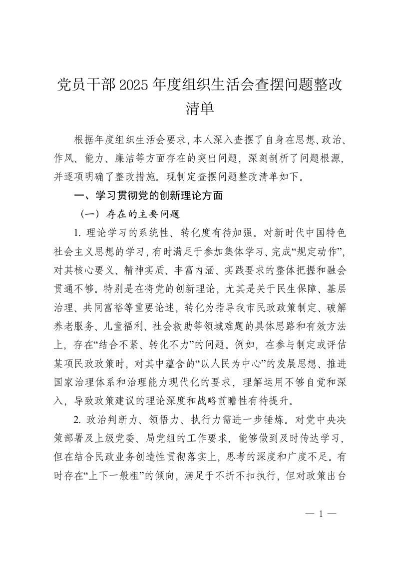 党员干部2025年度组织生活会查摆问题整改清单根据年度组织生活会要求,本人深入查摆了自身在思想、政治、作风、能力、廉洁等方面存在的突出问题,深刻剖析了问题根源,并逐项明确了整改措施。现制定查摆问题整改清单如下。一、学习贯彻党的创新理论方面(一)存在的主要问题1.理论学习的系统性、转化度有待加强。对新时代中国特色社会主义思想的学习,有时满足于参加集体学习、完成“规定动作”,对其核心要义、精神实质、丰富内涵、实践要求的整体把握和融会贯通不够。特别是在将党的创新理论,尤其是关于民生保障、基层治理、共同富裕等重要论述,转化为指导我市民政政策制定、破解养老服务、儿童福利、社会救助等领域难题的具体思路和有效方法上,存在“结合不紧、转化不力”的问题。例如,在参与制定或评估某项民政政策时,对其中蕴含的“以人民为中心”的发展思想、推进国家治理体系和治理能力现代化的要求,理解运用不够自觉和深入,导致政策建议的理论深度和战略前瞻性有待提升。2.政治判断力、领悟力、执行力需进一步锤炼。对党中央决策部署及上级党委、局党组的工作要求,能够做到及时传达学习,但在结合民政业务创造性贯彻落实上,思考的深度和广度不足。有时存在“上下一般粗”的倾向,满足于不折不扣执行,但对政策出台1的背景、战略意图以及本地民政领域需要把握的关键点、风险点,研究思考不够透彻。比如,在落实关于健全分层分类社会救助体系的要求时,更多关注本地现有政策的对接,对如何前瞻性研判救助需求变化、探索更精准高效的救助服务供给方式,主动谋划不足,政治执行力在“最后一公里”的精准落地、创新见效上体现不充分。3.意识形态风险防范意识有待增强。民政工作关系民生、连着民心,是社会关注的焦点,也是意识形态的重要领域。在日常工作中,对民政政策可能引发的社会舆论反应预判不足,对通过网络、信访等渠道反映的涉及民政工作的模糊认识或片面信息,有时敏感性不够,未能第一时间从政治高度审视其潜在影响,主动发声引导、澄清误解的意识和能力有待提高。对社会组织、养老机构等领域可能存在的意识形态风险点,缺乏常态化、制度化的分析研判习惯。(二)整改措施1.深化系统学习,强化理论武装。制定个人年度理论学习深化计划,明确学习重点篇目和时间安排。坚持读原著、学原文、悟原理,每季度至少精读一篇总书记最新重要讲话和关于民政民生工作的重要指示批示精神,并结合分管或从事的业务工作,撰写1-2篇有深度、有见解的学习体会或理论文章,着力在“深化、内化、转化”上下功夫,切实将学习成果转化为谋划民政工作的思路、促进民政事业发展的举措。2.提升政治能力,狠抓落实见效。建立健全政策学习研究机制,在接到上级决策部署或局党组工作安排后,首先深入学习领会2其政治意图和实践要求,主动研究民政领域落实的切入点、着力点。在起草文件、制定方案、推动工作时,自觉对标对表党的理论和路线方针政策,确保民政工作始终沿着正确政治方向前进。注重培养战略思维和底线思维,提高对民政领域复杂局面的政治研判能力。3.筑牢意识形态防线,压实政治责任。增强政治敏锐性和政治鉴别力,密切关注民政相关舆情动态,定期分析研判民政领域意识形态风险。在政策制定、宣传解读、信访接待等工作中,主动设置议题,弘扬主旋律,传播正能量。严格落实意识形态工作责任制相关要求,对职责范围内的意识形态阵地做到守土有责、守土负责、守土尽责(三)整改时限持续推进,长期坚持。力争在2026年6月底前,理论学习转化应用能力、政治执行力有明显提升,并形成常态。二、加强党性锤炼方面(一)存在的主要问题1.党性修养的自觉性、常态化有差距。在民政业务工作繁忙时,有时不自觉地放松了党性锻炼的标准和要求,将组织生活视为“软任务”,参加“三会一课”、主题党日等活动有时存在“身在心不在”的情况。对党章党规党纪的学习,特别是新修订的《中国共产党纪律处分条例》,满足于一般性了解,深入研读、对照检视不够,将其内化为日常行为规范和自觉遵循的意识和行动有待加强。艰苦3