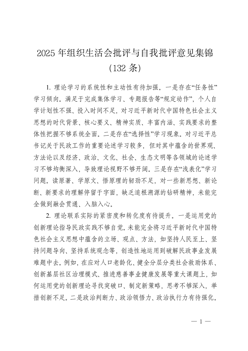 2025年组织生活会批评与自我批评意见集锦(132条)1.理论学习的系统性和主动性有待加强。一是存在“任务性”学习倾向。满足于完成集体学习、专题报告等“规定动作”,个人自学计划性不强、投入时间不足,对习近平新时代中国特色社会主义思想的时代背景、核心要义、精神实质、丰富内涵、实践要求的整体性把握不够系统全面。二是存在“选择性”学习现象。对习近平总书记关于民政工作的重要论述学习较多,但对其中蕴含的世界观、方法论以及经济、政治、文化、社会、生态文明等各领域的论述学习不够均衡深入,导致理论视野不够开阔。三是存在“浅表化”学习问题。读原著、学原文、悟原理的韧劲不足,对一些新思想、新论断、新要求的理解停留于字面,缺乏追根溯源的钻研精神,未能完全做到融会贯通、入脑入心。2.理论联系实际的紧密度和转化度有待提升。一是运用党的创新理论指导民政实践不够自觉。未能完全将习近平新时代中国特色社会主义思想中蕴含的立场、观点、方法,如坚持人民至上、坚持问题导向、坚持系统观念等,创造性地运用到破解民政事业发展难题中去。例如,在应对人口老龄化、健全分层分类社会救助体系、创新基层社区治理模式、推进慈善事业健康发展等重大课题上,如何运用党的创新理论寻找突破口、制定新策略,思考不够深入,举措创新不足。二是政治判断力、政治领悟力、政治执行力有待强化。1从政治高度观察和分析民政业务工作的能力尚有欠缺,有时就业务谈业务,未能始终将民政工作置于国家发展大局、全市中心工作中去考量和推进,在履行基本民生保障、基层社会治理、基本社会服务等职责时,贯彻落实上级决策部署的政治敏锐性和行动穿透力有待加强。3.理想信念的锤炼和党性修养的持续加固有待深化。一是在长期实践中,随着工作环境相对稳定,个别同志,尤其是临近退休的同志,不同程度出现了“歇脚松劲”心态,认为“大政方针有中央把握,具体工作有制度规范”,对持续强化理论武装、改造主观世界的重要性认识有所弱化,学习的紧迫感和主动性下降。二是运用科学理论改造世界观、人生观、价值观的自觉性不足。面对社会上多元思潮的影响,运用马克思主义立场观点方法进行辨析、抵御的能力有待提高;在面对民政服务对象诉求多元、矛盾复杂的情况下,运用党的创新理论站稳群众立场、廓清思想迷雾、坚定人民情怀的定力需要进一步夯实。理论学习的成果未能完全转化为坚不可摧的理想信念和无私奉献的党性原则。4.对“两个确立”决定性意义的领悟和践行需进一步深化。虽然能够认识到“两个确立”是新时代取得一切成就的根本所在,但在深刻把握其历史逻辑、理论逻辑、实践逻辑,并自觉转化为做到“两个维护”的实际行动上,还存在“温差“落差”。一是“知行合一”不够彻底。在谋划民政重点项目、制定惠民政策、推动改革举措时,如何更加自觉地向党的理论和路线方针政策看齐,如何将“两个维护”2具体体现到保障困难群众基本生活、维护特殊群体合法权益、提升公共服务水平等每一项具体工作中,思考谋划的前瞻性、系统性、精准性尚有不足。二是政治导向在日常工作中的融入不够自然。有时未能第一时间从政治角度审视业务工作可能产生的社会效应和政治影响,例如在出台涉及群众切身利益的政策时,对社会稳定风险的评估、对舆论导向的把握,政治敏锐性有待加强。5.从“国之大者”高度谋划和推进民政工作的站位需进一步提高。一是对新时代民政工作在推进中国式现代化进程中的职责使命理解不够深刻。对民政工作关乎民心向背、关系党的执政根基这一重大政治属性的认识,有时停留在概念层面,未能完全内化为“时时放心不下”的责任感和“民政为民、民政爱民”的强烈使命感。二是在服务大局中找准民政定位不够精准。围绕国家重大战略和全市发展中心任务,如何发挥民政部门在保障基本民生、助力乡村振兴、促进社会和谐等方面的独特作用,主动对接、系统谋划、精准发力的能力有待提升。工作有时局限于完成上级交办任务和常规业务,服务国家大局、全市发展的切入点和贡献度不够突出。6.机关党建与民政业务深度融合的成效需进一步彰显。一是“围绕中心抓党建、抓好党建促业务”的理念树得不够牢固。存在一定程度的重业务轻党建或党建业务“两张皮”现象。组织生活的内容和形式与民政中心工作、重点任务、难点问题结合不够紧密,例如,在研讨社会救助政策效能提升、养老服务体系完善、基层治理能力强化等议题时,如何有效嵌入党性分析、宗旨意识教育、作风锤炼