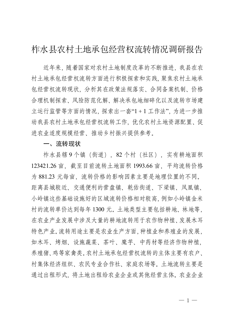 柞水县农村土地承包经营权流转情况调研报告近年来,随着国家对农村土地制度改革的不断推进,我县在农村土地承包经营权流转方面进行积极探索和实践,聚焦农村土地承包经营权流转现状,分析其在政策法规落实、合同备案机制、价格合理机制探索、风险防范化解、解决承包地细碎化以及流转市场建立运行监管等方面的情况,探索出一套“1+1工作法”,为进一步推动我县农村土地承包经营权流转工作,优化农村土地资源配置、促进农业适度规模经营、推动乡村振兴提供参考。一、流转现状柞水县辖9个镇(街道),82个村(社区),实有耕地面积123421.26亩,截至目前流转土地面积1993.66亩,平均流转价格为881.23元每亩,流转价格的影响因素主要是地理位置的不同。距离县城较近、交通便利的营盘镇、乾佑街道、下梁镇、凤凰镇、小岭镇这些基础设施好的区域流转价格相对较高,例如小岭镇金米村的流转单价达到每年1300元。土地类型主要包括耕地、林地等,在农业产业发展中涉及大量的耕地流转用于农作物种植、发展木耳特色产业。流转用途主要是农业生产方面,种植业和养殖业的发展,如木耳、烤烟、设施蔬菜、茶叶、魔芋、中药材等经济作物种植,养殖猪、鸡等家禽类。农村土地承包经营权流转的主体主要有农户、村集体经济组织、农民专业合作社、家庭农场等。土地流转主要是通过出租形式,将土地出租给农业企业或其他经营主体。农业企业1能够对流转后的土地进行大规模、集约化的开发与经营,有效提升土地的产出效益。二、做法及成效(一)政策引领+严格监管认真贯彻落实农业农村部《农村土地经营权流转管理办法》、《陕西省实施〈农村土地经营权流转管理办法〉细则》的通知、中办国办《关于引导农村土地经营权有序流转发展农业适度规模经营的意见》等政策法规,我县高度重视农村土地承包经营权流转工作,研究制定了《关于规范农村土地经营权流转工作的通知》《柞水县加强农村土地经营权流转审查备案方案》等规范性文件,深化认识、准确把握政策要求,遵循土地流转基本原则,规范流转行为、流转程序和合同管理,引导农村土地有序流转,建立风险防范机制,加强土地流转用途管制,科学防范土地流转风险。对受让方的主体资格、征信情况、农业持续经营能力及拟经营项目是否符合我县产业布局和产业发展规划等事项进行严格审查,使土地流转机制进一步健全完善。通过多种形式广泛宣传土地流转政策,提高农民对土地流转的认识和积极性。同时,加强对土地流转工作的指导和服务,规范土地流转行为,保障农民的合法权益。(二)健全制度+高效管理1.完善备案制度,规范备案流程。为加强农村土地经营权流转规范化管理,落实《农村土地经营权流转办法》,建立了完善的土地经营权流转合同信息备案制度,对土地流转面积30亩及以上2的实行分级审查备案。制定了《柞水县加强农村土地经营权流转审查备案方案》,明确了备案的范围、程序和要求,使用“土地流转台账信息平台”对农村土地流转合同台账备案进行信息化备案和管理,为土地流转工作提供了有力的信息支持。农经站承担着土地流转合同信息备案的主要管理职责,各镇的农业综合服务站协助开展具体工作,形成了县镇两级管理架构,对现有流转合同进行备案,并形成长效机制。规范合同文本,农户与受让方签订合同后提交镇级进行初步审查,镇级将初审合格的合同上报至农经站进行进一步审查并在系统中备案,确保合同内容合法、规范。县农经站每月一次定期对各镇(街道)土地流转合同备案工作进行检查,检查内容包括合同备案的数量、质量、备案流程的执行情况以及信息管理系统的使用情况等。2.工商企业等社会资本通过流转取得土地经营权审批情况。依据国家《农村土地承包法》以及《农村土地经营权流转管理办法》等法律法规,对工商企业等社会资本通过流转取得土地经营权进行审批。先由受让主体与承包方就流转面积、期限、价款等进行协商并签订流转意向协议书;然后受让主体按规定向镇(街道)人民政府提出申请,并提交相关材料。截至2024年11月,全县共审批工商企业等社会资本流转土地经营权项目2个,流转土地面积74.68亩。审批过程中,重点审查工商企业等社会资本的资质、经营能力以及项目的规划是否符合我县现代农业产业发展规划,是否用于农业生产经营、增加农民收入等方面,确保工商企业等社会资本依法