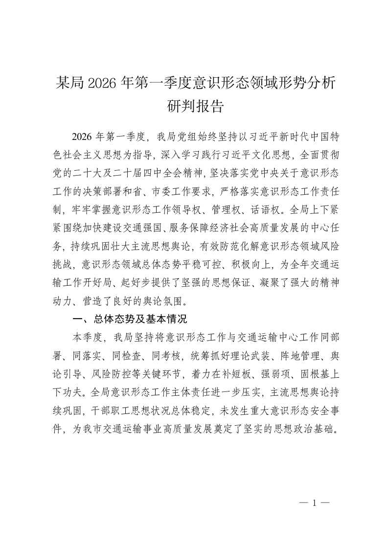 某局2026年第一季度意识形态领域形势分析研判报告2026年第一季度,我局党组始终坚持以习近平新时代中国特色社会主义思想为指导,深入学习践行习近平文化思想,全面贯彻党的二十大及二十届四中全会精神,坚决落实党中央关于意识形态工作的决策部署和省、市委工作要求,严格落实意识形态工作责任制,牢牢掌握意识形态工作领导权、管理权、话语权。全局上下紧紧围绕加快建设交通强国、服务保障经济社会高质量发展的中心任务,持续巩固壮大主流思想舆论,有效防范化解意识形态领域风险挑战,意识形态领域总体态势平稳可控、积极向上,为全年交通运输工作开好局、起好步提供了坚强的思想保证、凝聚了强大的精神动力、营造了良好的舆论氛围。一、总体态势及基本情况本季度,我局坚持将意识形态工作与交通运输中心工作同部署、同落实、同检查、同考核,统筹抓好理论武装、阵地管理、舆论引导、风险防控等关键环节,着力在补短板、强弱项、固根基上下功夫。全局意识形态工作主体责任进一步压实,主流思想舆论持续巩固,干部职工思想状况总体稳定,未发生重大意识形态安全事件,为我市交通运输事业高质量发展奠定了坚实的思想政治基础。1(一)深化理论武装,筑牢思想根基,凝聚发展共识始终将用党的创新理论武装头脑作为首要政治任务,持续在学懂弄通做实上下功夫,引导全局干部职工深刻领悟“两个确立”的决定性意义,增强“四个意识”、坚定“四个自信”、做到“两个维护”,不断夯实团结奋斗的共同思想基础。1.坚持以上率下,理论学习走深走实。局党组理论学习中心组切实发挥领学促学作用,严格落实“第一议题”制度,一季度组织专题学习研讨次。重点围绕习近平总书记关于发展新质生产力、扎实推进共同富裕、统筹发展和安全等重要论述,以及关于交通运输工作的重要指示批示精神,开展深入学习和交流研讨,班子成员带头撰写学习体会、调研报告篇,示范带动全局理论学习层层深入。各基层党组织依托“三会一课”、主题党日等,组织集中学习余次,覆盖党员余人次,推动理论学习融入日常、抓在经常。2.注重学用相长,推动成果转化运用。大力弘扬理论联系实际的学风,紧密联系我市交通运输发展实际,聚焦综合立体交通网建设、运输服务提质增效、行业治理现代化、安全生产等重点工作,组织开展专题调研次。将学习成果转化为谋划工作的思路、破解难题的举措、推动发展的能力,例如,在优化公交线网布局、提升农村公路管养水平、推进智慧交通建设等具体工作中,自觉运用新发展理念指导实践,形成了一批具有针对性、操作性的工作方案和政策建议,切实将学习成效体现到推动交通运输高质量发展的实际行动上。3.创新方式载体,激发全员学习热情。积极适应新时代干部职工学习特点,创新学习形式和载体。开设“交通大讲堂”,邀请专家学者、业务骨干授课期;举办“书香交通”读书分享会、“青年思享汇”等活动场;充分利用“学习强国”学习平台、局内网学习专栏、微信公众号等线上阵地,推送学习资料、交流学习心得。通过线上线下相结合、集中学习与个人自学相补充,营造了浓厚的学习氛围,有效提升了理论学习的吸引力和感染力,干部职工的政治素养和理论水平得到进一步提升。(二)强化阵地建设,规范宣传管理,壮大主流舆论深刻认识意识形态阵地的极端重要性,坚持守土有责、守土负责、守土尽责,不断加强各类意识形态阵地的建设、管理和运用,确保可管可控、风清气正,持续巩固壮大奋进新时代的主流思想舆论。1.严格内容审核,管好用好自有平台。严格执行信息发布“三审三校”制度,对局官方网站、微信公众号、内部刊物、宣传栏等各类宣传载体发布的信息内容进行严格政治把关和内容审核,确保导向正确、内容准确、表述规范。一季度,局属各平台累计发布各类信息余条,未出现任何政治性、导向性错误。同时,加强对局属单位网站、新煤体账号的日常监管和指导,定期开展排查清理,确保全局宣传阵地规范有序、安全运行。2.聚焦中心工作,精心组织主题宣传。紧紧围绕2026年全市交通运输工作会议部署的重点任务,策划开展“交通先行开新局”3
