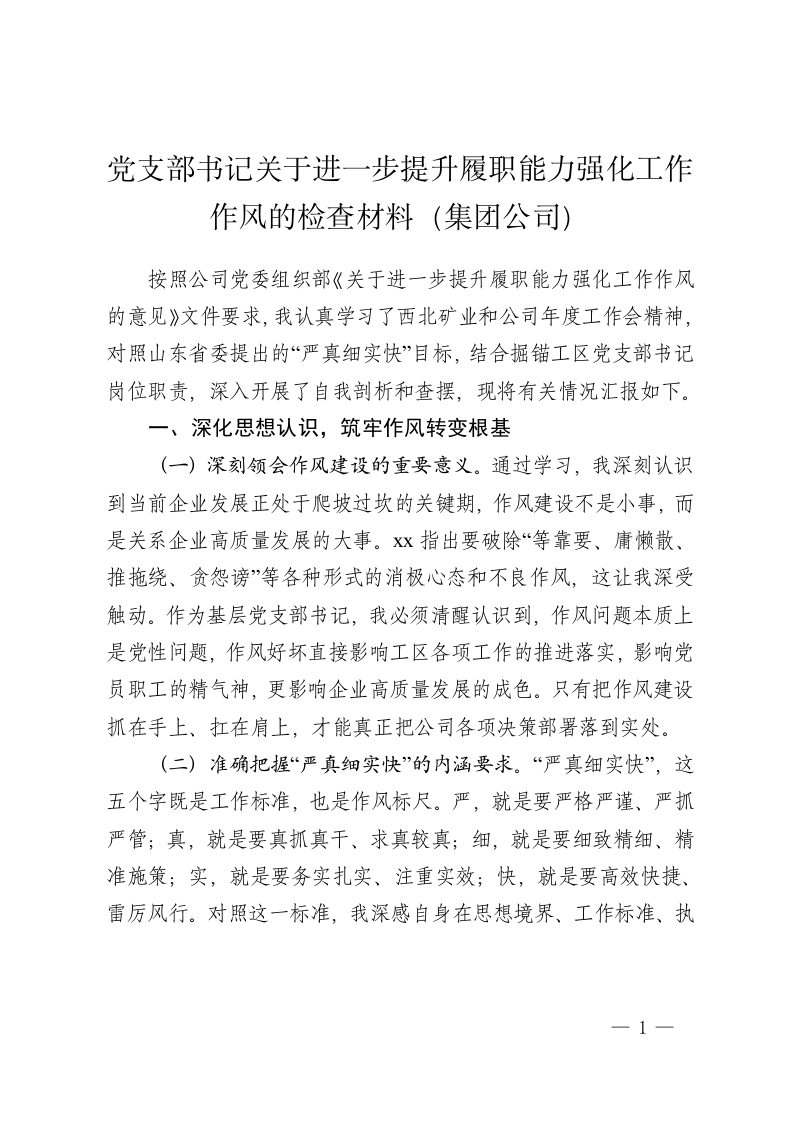 党支部书记关于进一步提升履职能力强化工作作风的检查材料(集团公司)按照公司党委组织部《关于进一步提升履职能力强化工作作风的意见》文件要求,我认真学习了西北矿业和公司年度工作会精神,对照山东省委提出的“严真细实快”目标,结合掘锚工区党支部书记岗位职责,深入开展了自我剖析和查摆,现将有关情况汇报如下。一、深化思想认识,筑牢作风转变根基(一)深刻领会作风建设的重要意义。通过学习,我深刻认识到当前企业发展正处于爬坡过坎的关键期,作风建设不是小事,而是关系企业高质量发展的大事。Xx指出要破除“等靠要、庸懒散、推拖绕、贪怨谤”等各种形式的消极心态和不良作风,这让我深受触动。作为基层党支部书记,我必须清醒认识到,作风问题本质上是党性问题,作风好坏直接影响工区各项工作的推进落实,影响党员职工的精气神,更影响企业高质量发展的成色。只有把作风建设抓在手上、扛在肩上,才能真正把公司各项决策部署落到实处。(二)准确把握“严真细实快”的内涵要求。“严真细实快”,这五个字既是工作标准,也是作风标尺。严,就是要严格严谨、严抓严管;真,就是要真抓真干、求真较真;细,就是要细致精细、精准施策;实,就是要务实扎实、注重实效;快,就是要高效快捷、雷厉风行。对照这一标准,我深感自身在思想境界、工作标准、执1行力度等方面还存在明显差距,必须以此次研讨查摆为契机,切实提升思想境界、转变工作作风。(三)切实增强履职尽责的使命担当。文件强调要“把思想作风转变贯穿到各项工作的研究、谋划、部署、落实、督导、总结各环节全过程”,这对基层党支部书记提出了更高要求。我深刻认识到,作为掘锚工区党支部书记,既要抓好党建主责主业,又要推动党建与生产经营深度融合;既要带头高标准严要求,又要带动工区全体党员职工心往一处想、劲往一处使。当前,公司正处于2026年开局起步和“十五五”规划谋划的关键节点,更需要我以身作则、率先垂范,把作风建设成效转化为推动工区高质量发展的实际行动。二、坚持问题导向,深入查摆自身不足(一)理论学习不够深入系统,存在学用脱节现象。对照“严真细实快”中的“真”字要求,我在理论学习上还存在明显短板。日常学习中,往往满足于会议传达、文件宣读,对党的创新理论缺乏体系化研读规划,没有真正构建起“原文精读、专题研讨、实践转化”的闭环学习机制。有时存在“以干代学”的思想倾向,把学习当作“软任务”,对新思想、新论断、新要求的学习流于表面,没有做到学深悟透、融会贯通。在组织工区日常党建工作过程中,往往局限于上级党组织安排的规定内容,对个别党员学习教育引导作用发挥不充分,主动宣传党的新形势新任务新要求方面还有局限性,导致理论学习与实际工作结合不够紧密,指导实践的效果不够突出。2(二)工作作风不够扎实过硬,存在“庸懒散”倾向。对照“严真细实快”中的“实”字要求,我在工作作风上还存在差距。有时在推动工作落实过程中,存在“差不多”思想,满足于完成规定动作,缺乏精益求精的工作标准。在党建品牌创建方面,虽然提出了“双驱动五支撑”品牌构想,但内涵挖掘不深、宣传推广乏力,未能充分发挥示范引领效应。党员群众对党建品牌了解不深,宣传方式单一,没有充分利用线上线下载体扩大影响,缺乏长效宣传机制,品牌凝聚人心、发动工作的作用未有效释放。在日常工作中,有时存在满足心理,持续创新攻坚克难的工作韧劲不足,工作创新力度不够,以新思想新理论指导具体实践工作的结合度不够、针对性不强。(三)履职担当不够积极主动,存在“等靠要”心态。对照“严真细实快”中的“快”字要求,我在工作主动性上还有不足。在推进支部建设过程中,有时存在“等上级安排、靠上级推动”的被动思想,主动谋划、提前布局的意识不够强。在人才队伍建设方面,虽然培养预备党员2人、积极分子5人,但对青年职工的跟踪培养、实践锻炼还不够系统,让优秀人才在实践磨砺中快速成长的机制还不够完善。在安全生产与党建融合方面,推动党员抓隐患、包保标准化等工作的举措还不够精准,方式方法不够灵活,破解难题的主动性不足。有时面对工作中的困难和矛盾,缺乏敢碰硬、敢较真的精神,工作推进的力度和速度还不够理想。
