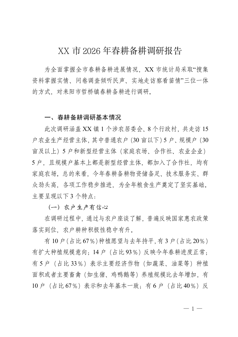 XX市2026年春耕备耕调研报告为全面掌握全市春耕备耕进展情况,XX市统计局采取“搜集资料掌握实情、问卷调查倾听民声、实地走访察看苗情”三位一体的方式,对耒阳市哲桥镇春耕备耕进行调研。一、春耕备耕调研基本情况此次调研涵盖XX镇1个涉农居委会、8个行政村,共走访15户农业生产经营主体,其中普通农户(30亩以下)5户、规模户(30亩及以上)5户和新型经营主体(家庭农场、合作社、农业企业)5户,且规模户基本上都是新型经营主体,都加入了合作社,均有家庭农场。总的来看,今年春耕备耕物资储备足、技术服务实、群众劲头高,各项工作稳步推进,为全年粮食生产奠定了坚实基础。主要呈现以下3个特点:(一)农户生产有信心在调研过程中,通过与农户座谈了解,普遍反映国家惠农政策落实到位,农户耕种积极性稳中有升。有10户(占比67%)种植愿望与去年持平,有3户(占比20%)有扩大种植规模意向;14户(占比93%)反映今年春耕进度正常;有5户(占比33%)表示主要经济作物(如蔬菜、油菜等)种植面积或者主要畜禽(如生猪、鸡鸭鹅等)养殖规模比去年增加,有10户(占比67%)表示和去年基本一致;有6户(占比40%)反1映冬油菜当前长势比去年好,有9户反映(占比60%)和去年基本一致。大部分农户规划好全年种植计划,都表示上半年种一茬油菜和一茬水稻,下半年种再生水稻和各类蔬菜,并计划利用红斑地、荒山地种植棉花。(二)农业技术有支撑调研发现,农技推广服务在基层落地见效,农户科学种田的意识明显增强。大部分农户反映都租赁农机进行整地、播种等作业,尤其是规模户与新型经营主体使用农机率普遍较高,部分还租赁无人机作业,个别规模户农忙时还主动用农机帮助困难散户耕种。春耕备耕期间,运用集中育秧大棚等设施有10户(占比67%),其中育秧大棚使用率在80%及以上有4户(占比27%),使用率在50%-80%有1户(占比7%),使用率在20%-50%有2户(占比13%),使用率在20%以下有3户(占比20%)。根据XX市春耕生产会议精神,耒阳市结合实际,按平均45元/亩的标准作为机插机抛补贴资金,有力提升了农业机械化程度。(三)农资供应有保障从调研情况看,今年春耕农资准备早、货源足。耒阳市政府采购早稻种子35.5万公斤,基本满足春耕需要。2在农资储备方面,15户受访农户均已开始采购种子、化肥、农药等物资,其中11户(占比73%)表示农资已备齐或完成预订,4户(占比27%)正在陆续采购中,预计3月底前全部到位。在农资价格方面,12户(占比80%)反映今年种子、化肥价格与去年基本持平,3户(占比20%)表示部分肥料价格略有上涨但仍在可接受范围内。在质量监管方面,农户普遍反映农资经营点管理规范,未发现假冒伪劣农资流入田间地头。二、农户反映的主要问题在调研中也发现,当前春耕生产仍面临一些现实困难和突出问题,农户反映较为集中,主要表现在以下4个方面:(一)粮食收购压价,挫伤种粮热情农户普遍反映,在粮食销售过程中,收购企业存在不规范行为。部分粮贩和收购点利用农户急于售粮心理,在杂质、水分测定上缺乏客观标准,普遍存在“压级压价”现象,农户往往只能被动接受,实际出售粮食量、粮价和预期有较大差距,受访中有14户农户(占比93%)期盼提高收购价格。在集中售粮期,受外来经销商的影响,售粮排队时间过长,拉粮货车结算车费增加了售粮成本。(二)农资成本上涨,压缩收益空间尽管国家有保供稳价政策,但农资上涨依然明显。与去年同期相比,化肥(尤其是钾肥、复合肥)、农药价格均出现不同程度上涨。调研过程中,有1户(占比7%)反映今年春耕备耕整体进度3