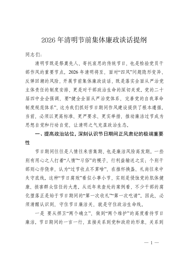 2026年清明节前集体廉政谈话提纲同志们:清明节既是祭奠先人、寄托哀思的传统节日,也是检验党员干部作风的重要节点。2026年清明将至,面对“四风”问题隐形变异、反弹回潮的风险,开展节前集体廉政谈话,既是落实全面从严治党主体责任的制度安排,更是对干部政治生命的深切关爱。党的二十届四中全会强调,要“健全全面从严治党体系,完善党的自我革命制度规范体系”,这为我们抓好节日期间作风建设提供了根本遵循。当前,必须以更高标准、更严要求、更实举措,推动廉洁过节成为思想自觉和行动自觉,让清明之气充盈政治生态。一、提高政治站位,深刻认识节日期间正风肃纪的极端重要性节日期间往往是人情往来密集期,也是廉洁风险高发期。一些别有用心之人打着“人情习俗”的幌子,行利益输送之实;个别干部则心存饶幸,认为“过节收点不算啥”,在推杯换盏、礼尚往来中失守底线。这种“节日腐败”看似小事小节,实则是侵蚀党的肌体健康、损害群众信任的大患。从近年来查处的案例看,不少干部的腐化堕落正是始于节日期间的“第一次收礼“第一次吃请”。因此,必须清醒认识到,守住节日廉洁关,就是守住政治生命线。一是要从捍卫“两个确立”、做到“两个维护”的高度看待节日廉洁。节日期间的一言一行,直接关系到党和政府的形象,关系到1人民群众对全面从严治党的信心。能否做到清清爽爽过节,是对党员干部政治判断力、政治领悟力、政治执行力的现实检验。二是要从推进党的自我革命的战略全局把握节日监督。节日是观察党风政风的“晴雨表”,也是推进作风建设的“突破口”。只有紧盯一个个节点,解决一个个具体问题,才能积小胜为大胜,不断巩固拓展反腐败斗争压倒性胜利。三是要从守护个人前途命运的切身利益出发严守纪律红线。一次违规收礼、一次公车私用,都可能成为人生的“滑铁卢”。唯有心存敬畏、手握戒尺,方能行稳致远、平安一生。二、聚焦关键环节,精准防范节日期间易发多发的廉洁风险清明节期间,需特别警惕以下几类突出问题:借祭扫之名公款报销私人费用、使用公车或借用管理服务对象车辆进行私人祭扫、在祭扫活动中讲排场比阔气、借机收受管理服务对象礼品礼金、参与封建迷信活动等。这些问题虽表现形式各异,但本质都是特权思想作祟、纪律意识淡薄。(一)严管“车轮上的腐败”。公车姓“公”不姓“私”,节日期间必须严格执行公务用车封存停驶制度,确因工作需要使用的,必须严格履行审批程序,并全程留痕可查。严禁任何形式的公车私用、私车公养。(二)严防“舌尖上的歪风”。祭扫期间的聚餐活动,必须坚持勤俭节约原则,严禁用公款大吃大喝,严禁出入私人会所或高档消费场所,严禁接受可能影响公正执行公务的宴请。2(三)严控“人情往来的陷阱”。要分清正常人情往来与违规收送礼品礼金的界限,对管理服务对象、私营企业主等赠送的礼品、礼金、消费卡等,必须坚决拒收。一时无法拒收的,应按规定及时上交组织。(四)严守“生活作风的底线”。党员干部要带头移风易俗,文明祭扫,自觉抵制焚烧纸钱、燃放鞭炮等陈规陋习,更不得参与任何形式的封建迷信活动,始终保持共产党人的先进性和纯洁性。三、压实主体责任,构建齐抓共管的节日廉洁保障体系廉洁过节不是一句空话,需要各级党组织和全体党员干部同向发力、同题共答。各级“一把手”要切实履行好第一责任人职责,既要以身作则、率先垂范,又要敢抓敢管、严抓严管。对苗头性、倾向性问题要及时咬耳扯袖、红脸出汗,防止小错酿成大祸。(一)强化教育引导,筑牢思想堤坝。要通过廉政谈话、警示教育、发送廉洁提醒短信等多种形式,早打招呼、早作提醒,把纪律和规矩挺在前面,让党员干部知敬畏、存戒惧、守底线。(二)强化监督检查,形成有力震慑。纪检监察机关要加大节日期间的明察暗访力度,畅通群众监督渠道,对顶风违纪行为发现一起、查处一起、通报一起,持续释放越往后执纪越严的强烈信号。(三)强化家风建设,共筑廉洁防线。要教育引导党员干部注重家庭、家教、家风,管好自己的配偶、子女和身边工作人员,以清廉家风涵养清朗党风政风,共同守护好温馨幸福的家庭港湾。
