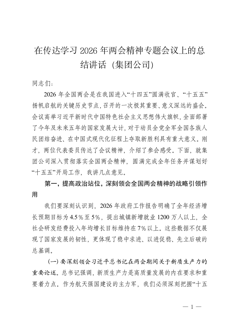 在传达学习2026年两会精神专题会议上的总结讲话(集团公司)