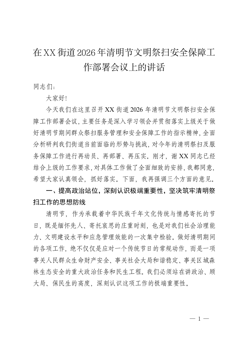 在XX街道2026年清明节文明祭扫安全保障工作部署会议上的讲话