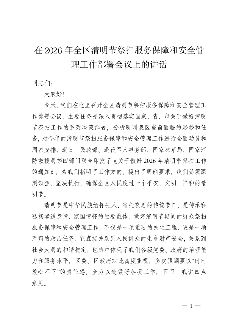 在2026年全区清明节祭扫服务保障和安全管理工作部署会议上的讲话