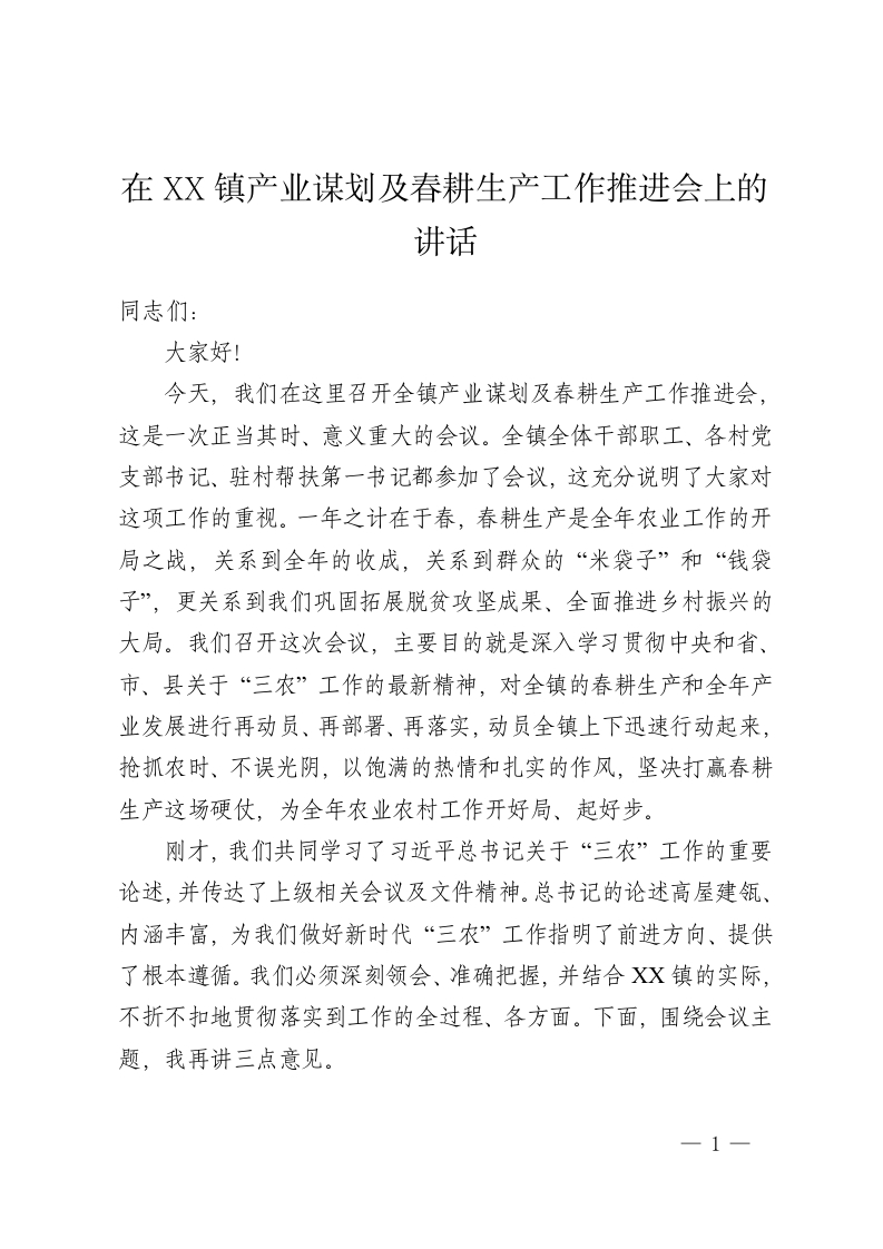 在 XX镇产业谋划及春耕生产工作推进会上的讲话