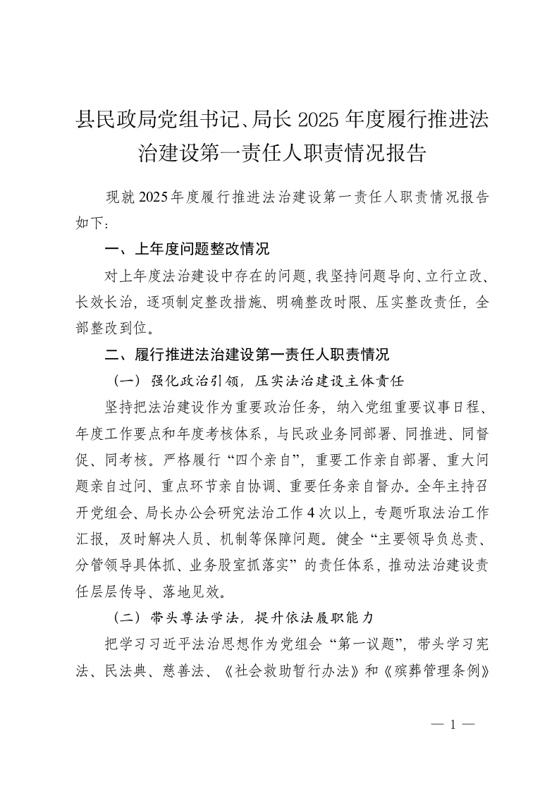 县民政局党组书记、局长 2025年度履行推进法治建设第一责任人职责情况报告