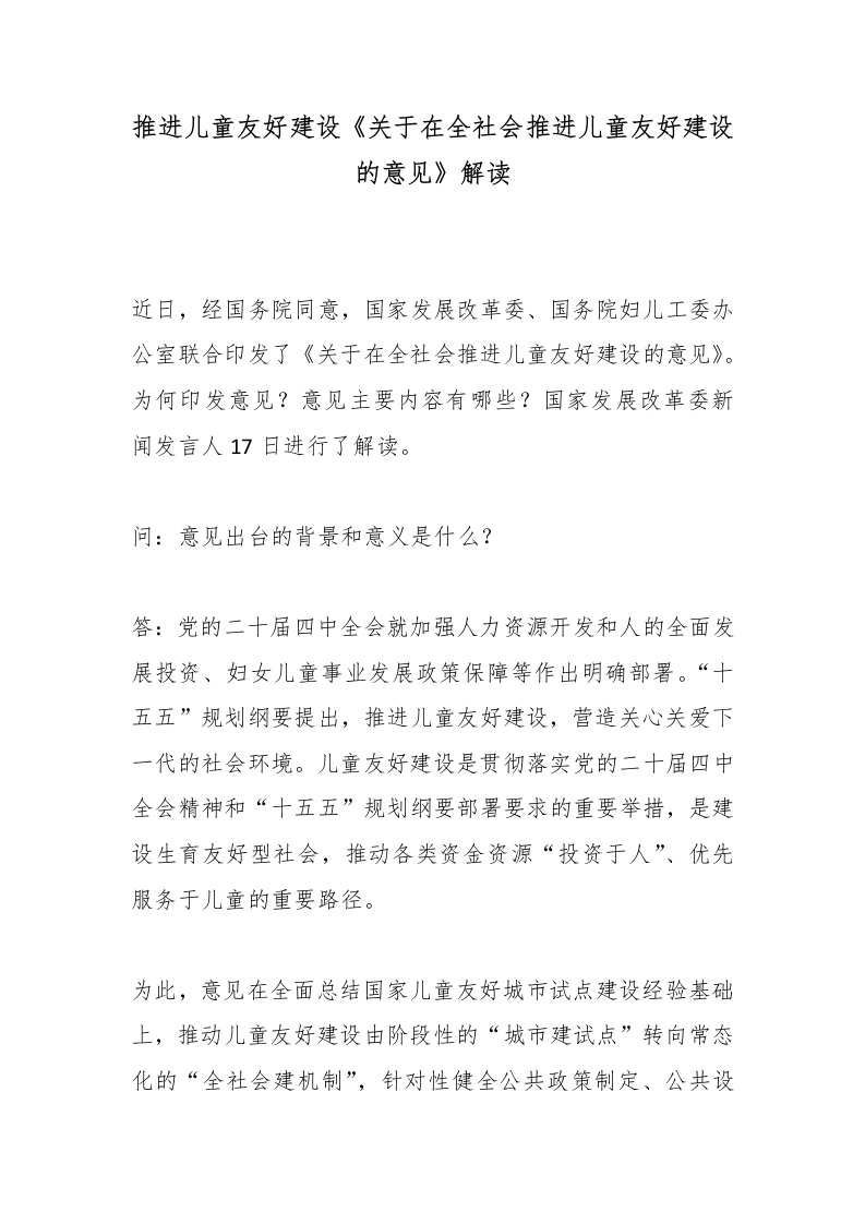 推进儿童友好建设《关于在全社会推进儿童友好建设的意见》解读