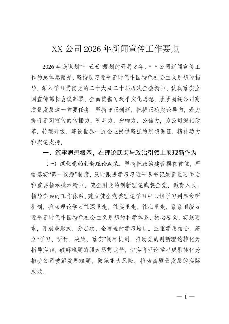 首页公文大全工作要点XX公司2026年新闻宣传工作要点