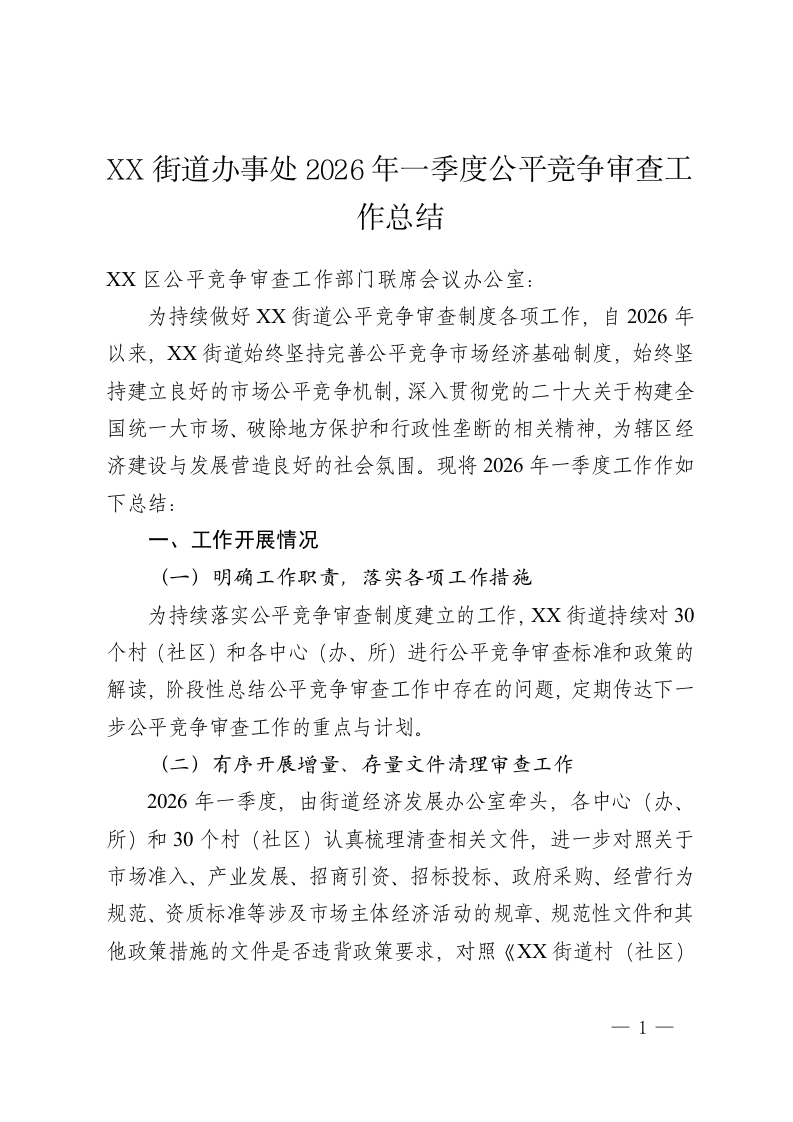 XX街道办事处2026年一季度公平竞争审查工作总结