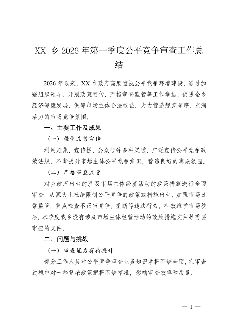 XX 乡2026年第一季度公平竞争审查工作总结