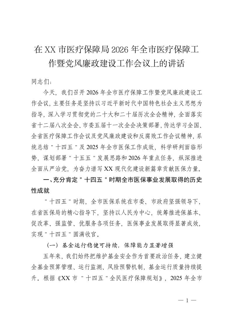 在 XX 市医疗保障局2026年全市医疗保障工作暨党风廉政建设工作会议上的讲话
