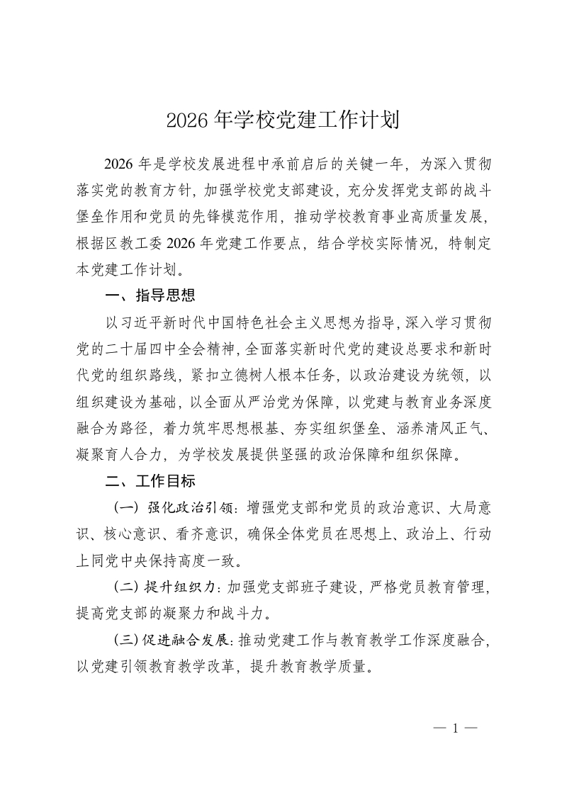 2026 年学校党建工作计划