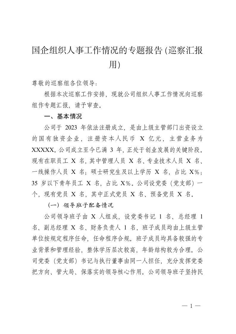 国企组织人事工作情况的专题报告(巡察汇报用)