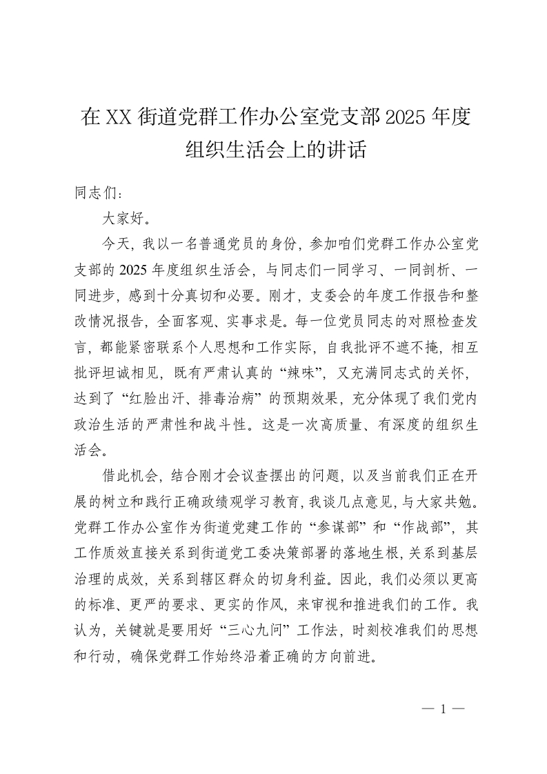 在 XX街道党群工作办公室党支部 2025年度组织生活会上的讲话