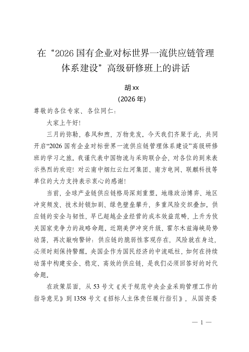 在“2026国有企业对标世界一流供应链管理体系建设”高级研修班上的讲话