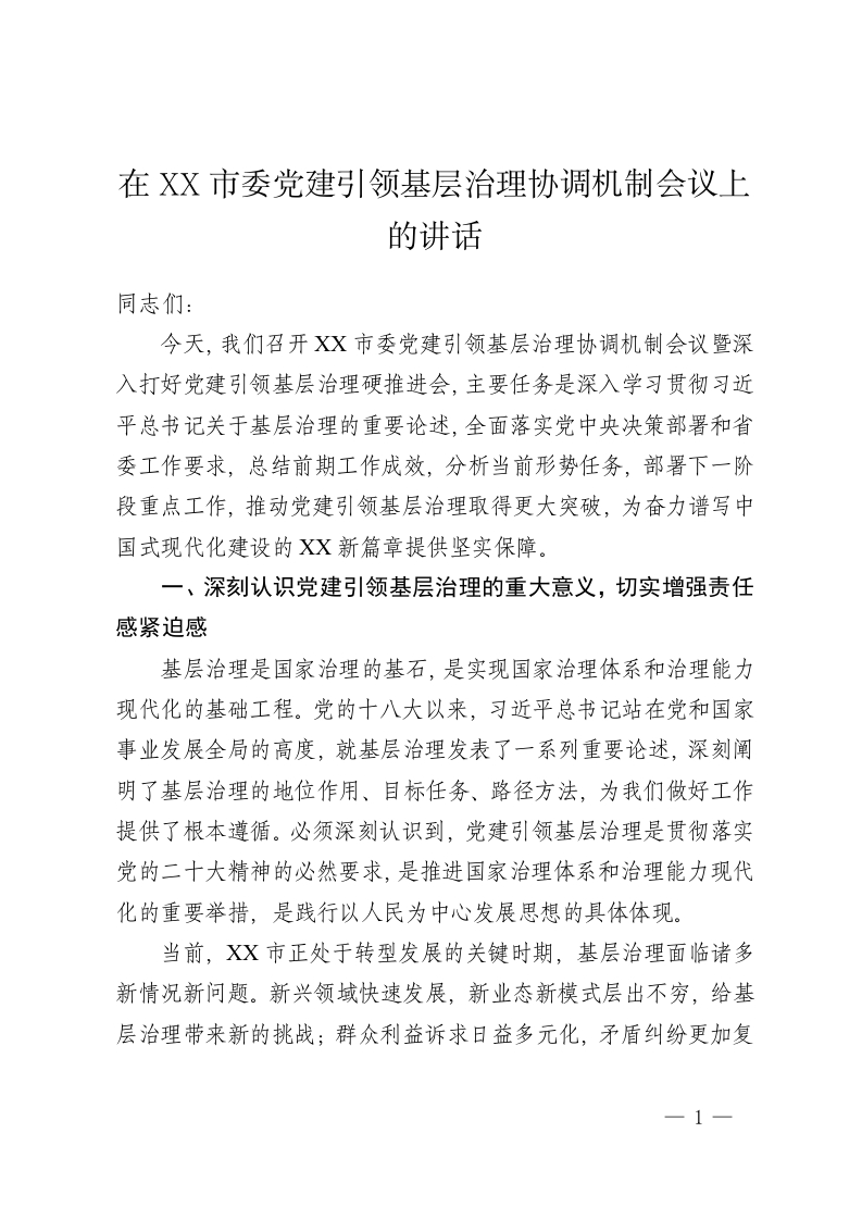 在 XX市委党建引领基层治理协调机制会议上的讲话