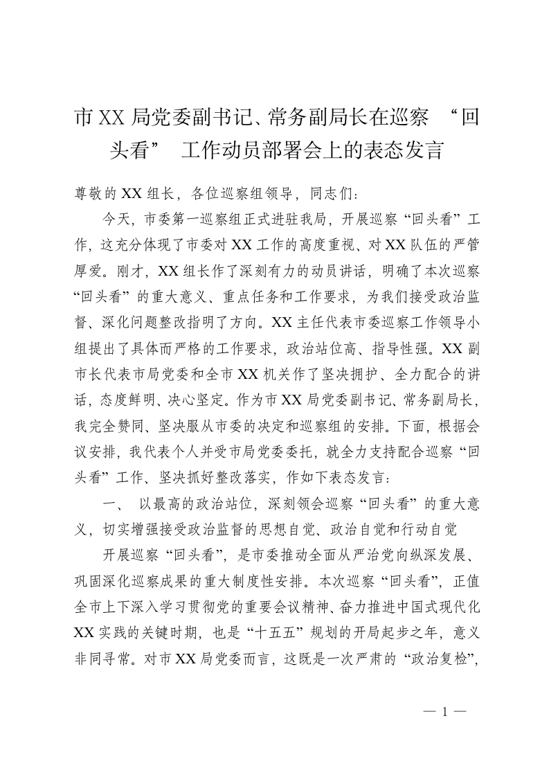 市 XX局党委副书记、常务副局长在巡察 “回头看” 工作动员部署会上的表态发言