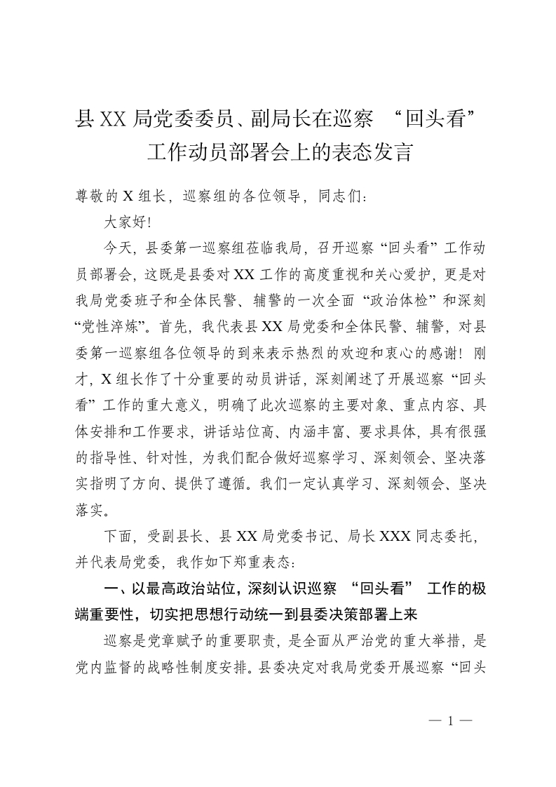 县 XX局党委委员、副局长在巡察 “回头看” 工作动员部署会上的表态发言