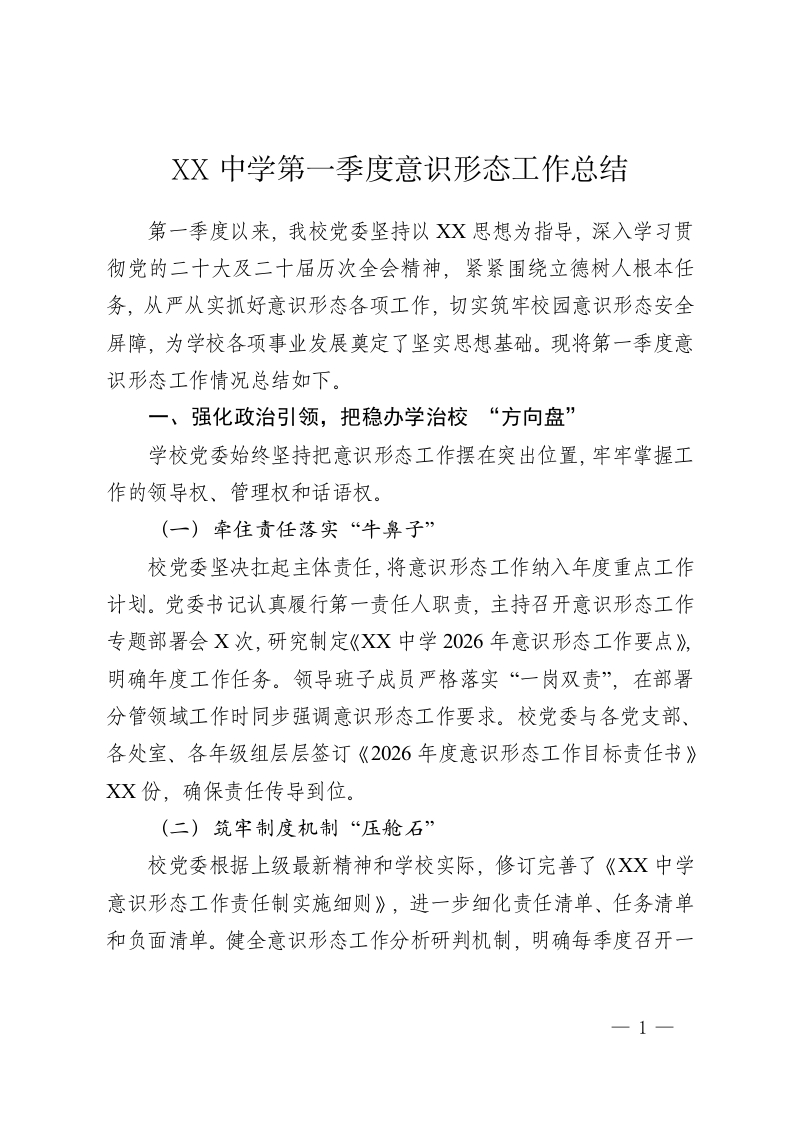 首页公文大全总结报告XX 中学第一季度意识形态工作总结