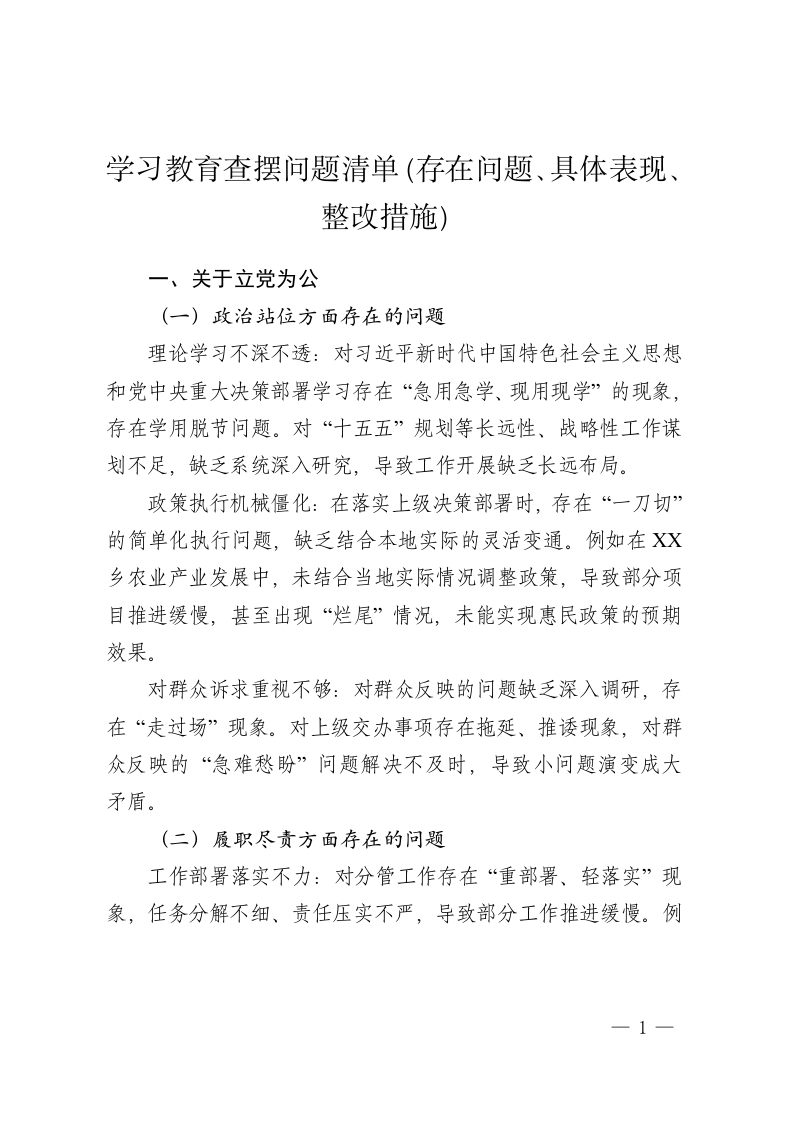 学习教育查摆问题清单(存在问题、具体表现、整改措施)