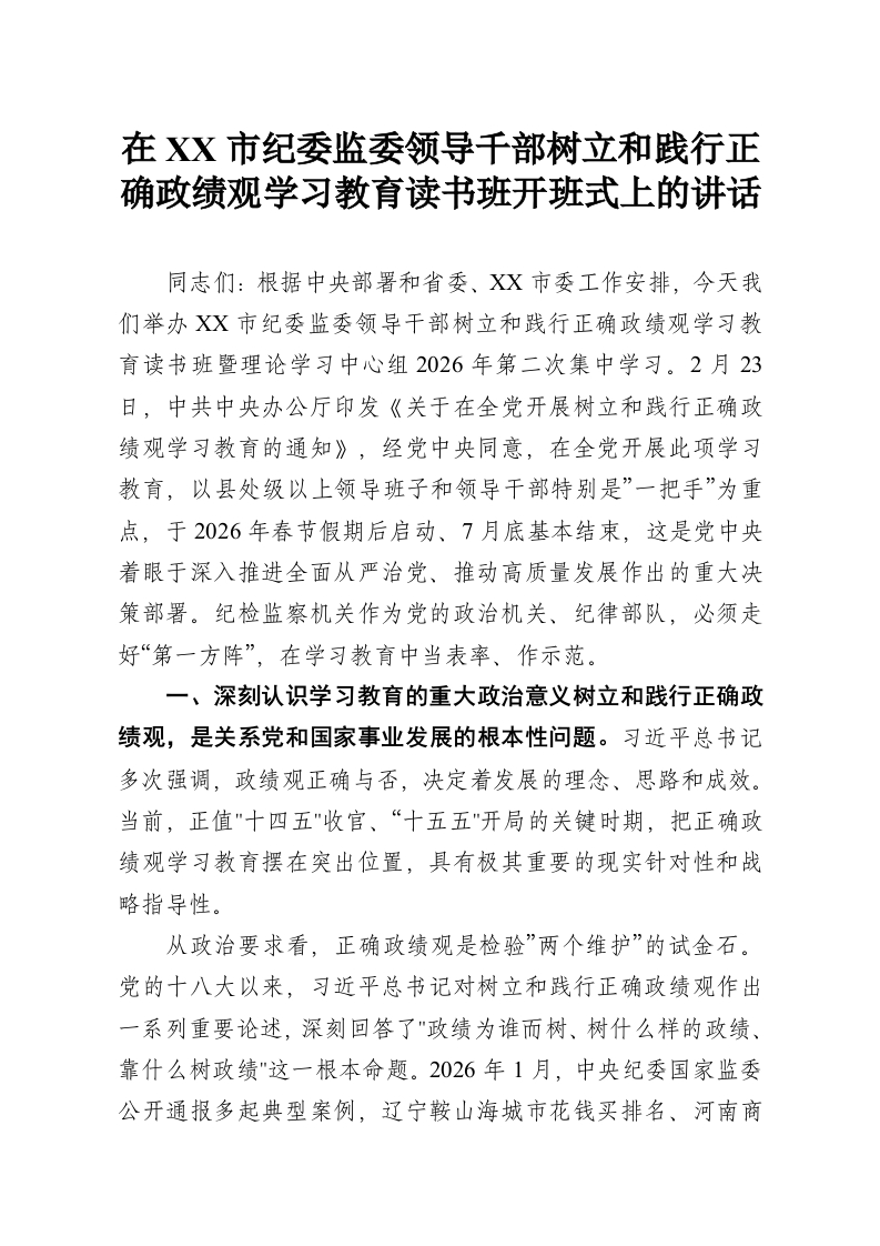 在市纪委监委领导千部树立和践行正确政绩观学习教育读书班开班式上的讲话