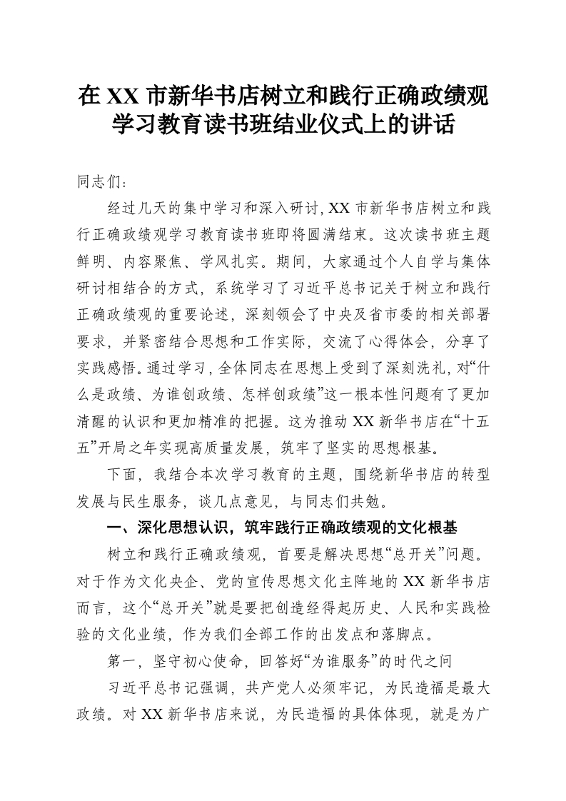 在市新华书店树立和践行正确政绩观学习教育读书班结业仪式上的讲话