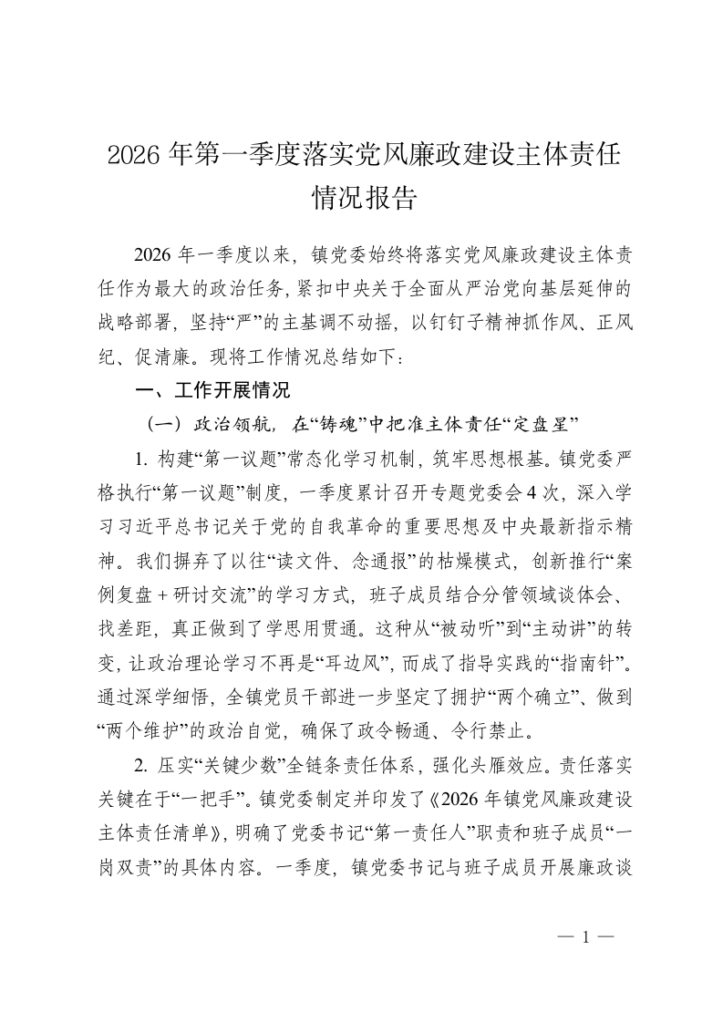 2026年第一季度落实党风廉政建设主体责任情况报告