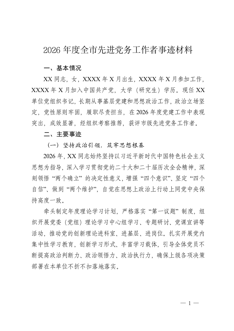 2026年度全市先进党务工作者事迹材料