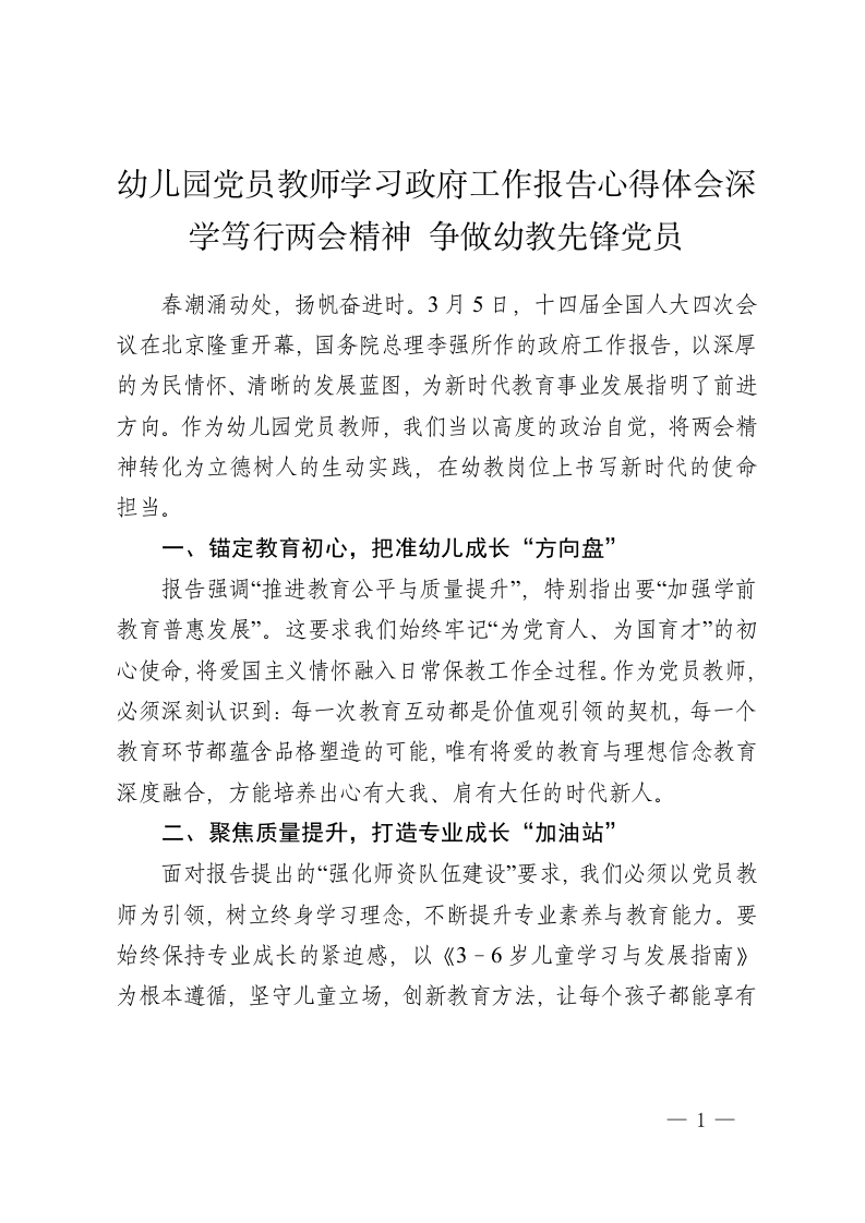 幼儿园党员教师学习政府工作报告心得体会深学笃行两会精神 争做幼教先锋党员