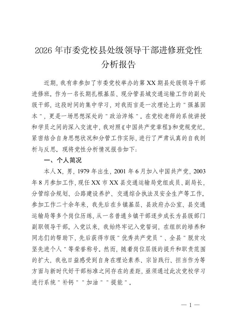 2026年市委党校县处级领导干部进修班党性分析报告