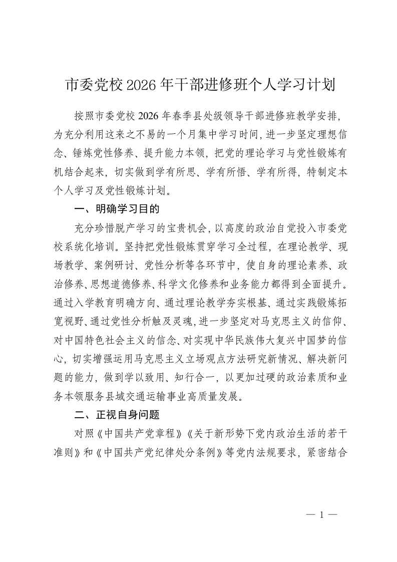市委党校2026年干部进修班个人学习计划