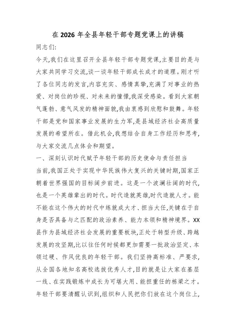 在2026年全县年轻干部专题党课上的讲稿