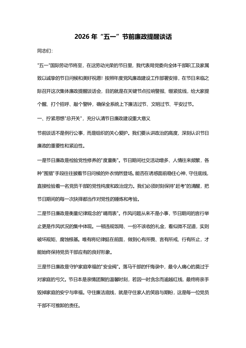 首页公文大全讲话发言2026年“五一”节前廉政提醒谈话