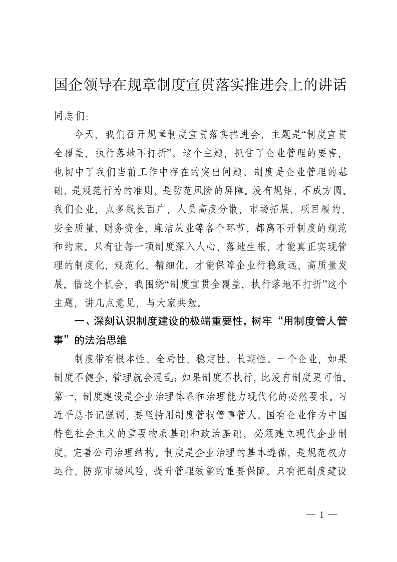 国企领导在规章制度宣贯落实推进会上的讲话