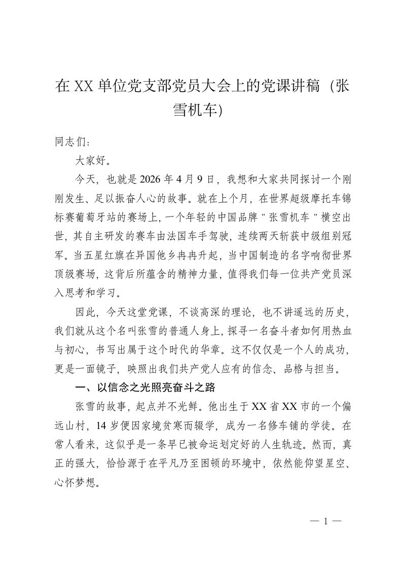 首页公文大全党课讲稿 在 XX单位党支部党员大会上的党课讲稿(张雪机车)