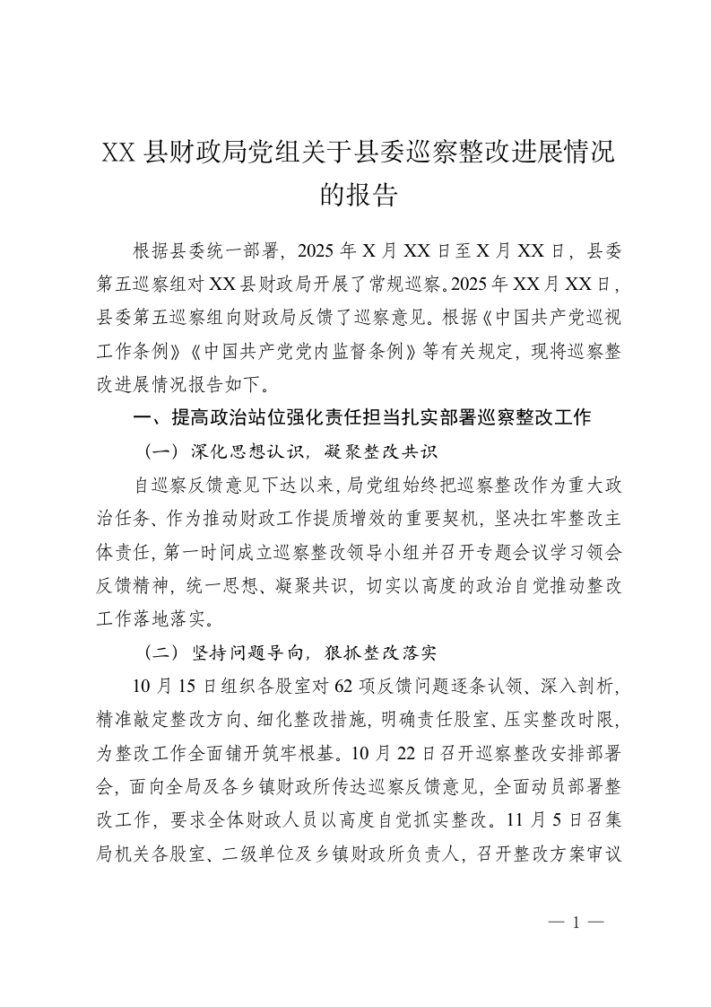 XX县财政局党组关于县委巡察整改进展情况的报告