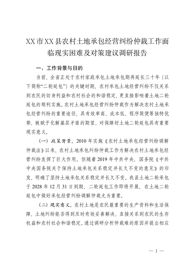 XX市XX县农村土地承包经营纠纷仲裁工作面临现实困难及对策建议调研报告