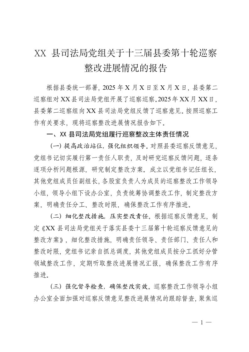 XX 县司法局党组关于十三届县委第十轮巡察整改进展情况的报告