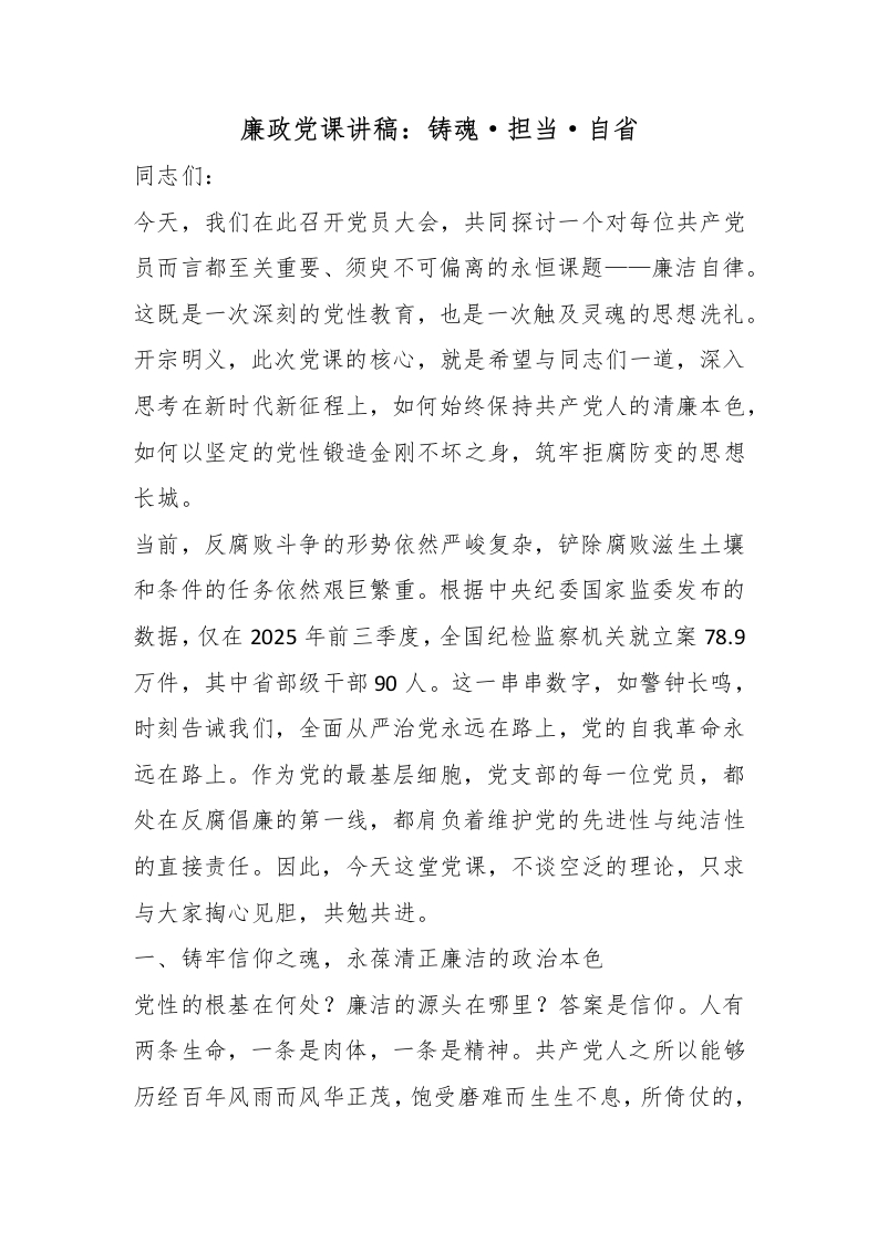 首页PPT课件模板PPT课件模板廉政党课讲稿:铸魂·担当·自省
