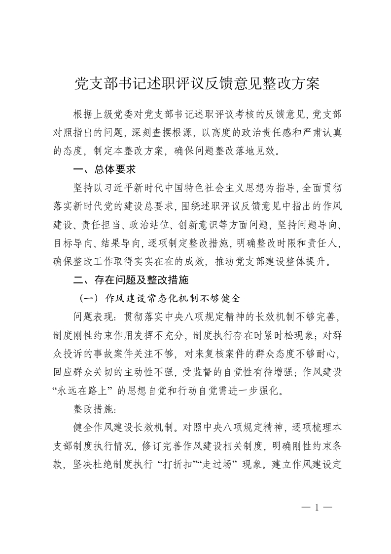 党支部书记述职评议反馈意见整改方案