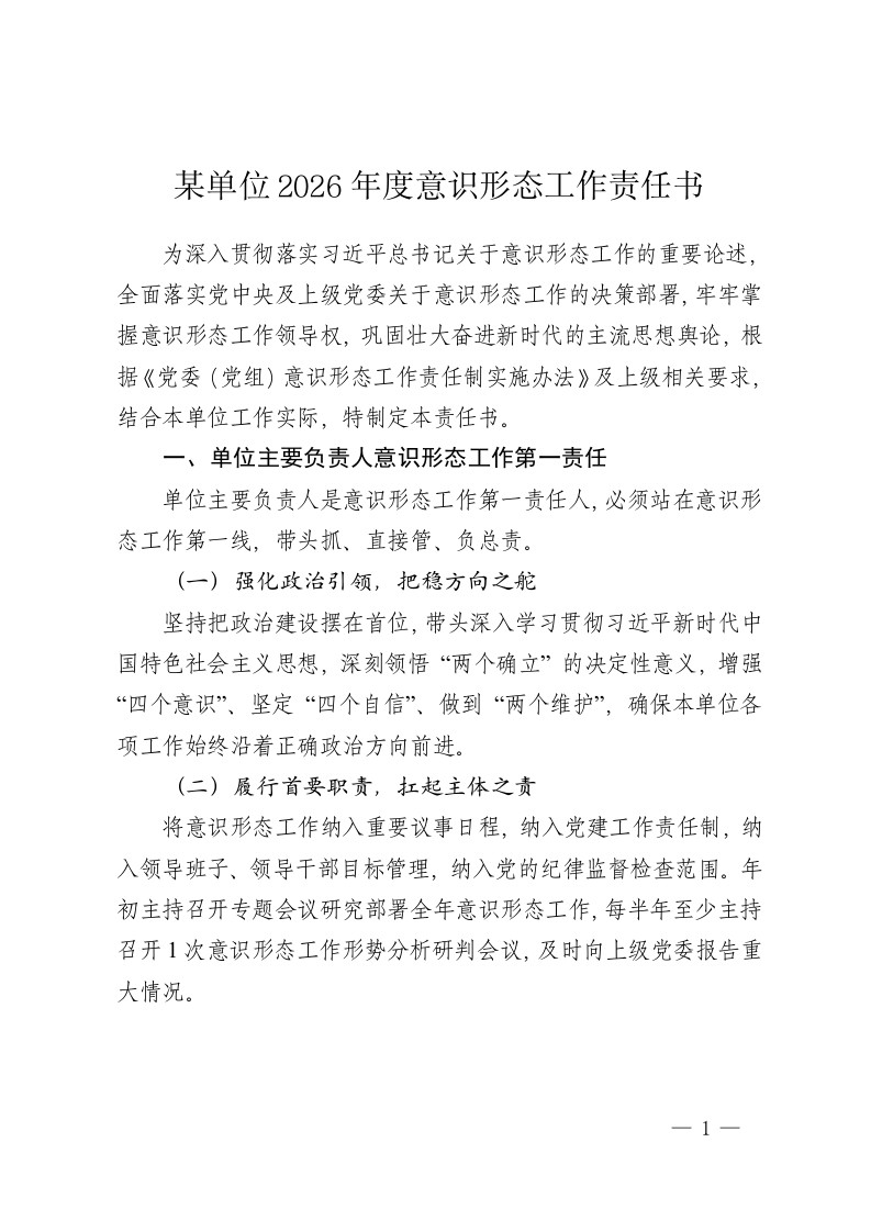 首页公文大全工作汇报某单位 2026年度意识形态工作责任书