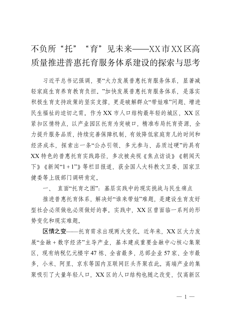 不负所“托”“育”见未来——XX市XX区高质量推进普惠托育服务体系建设的探索与思考