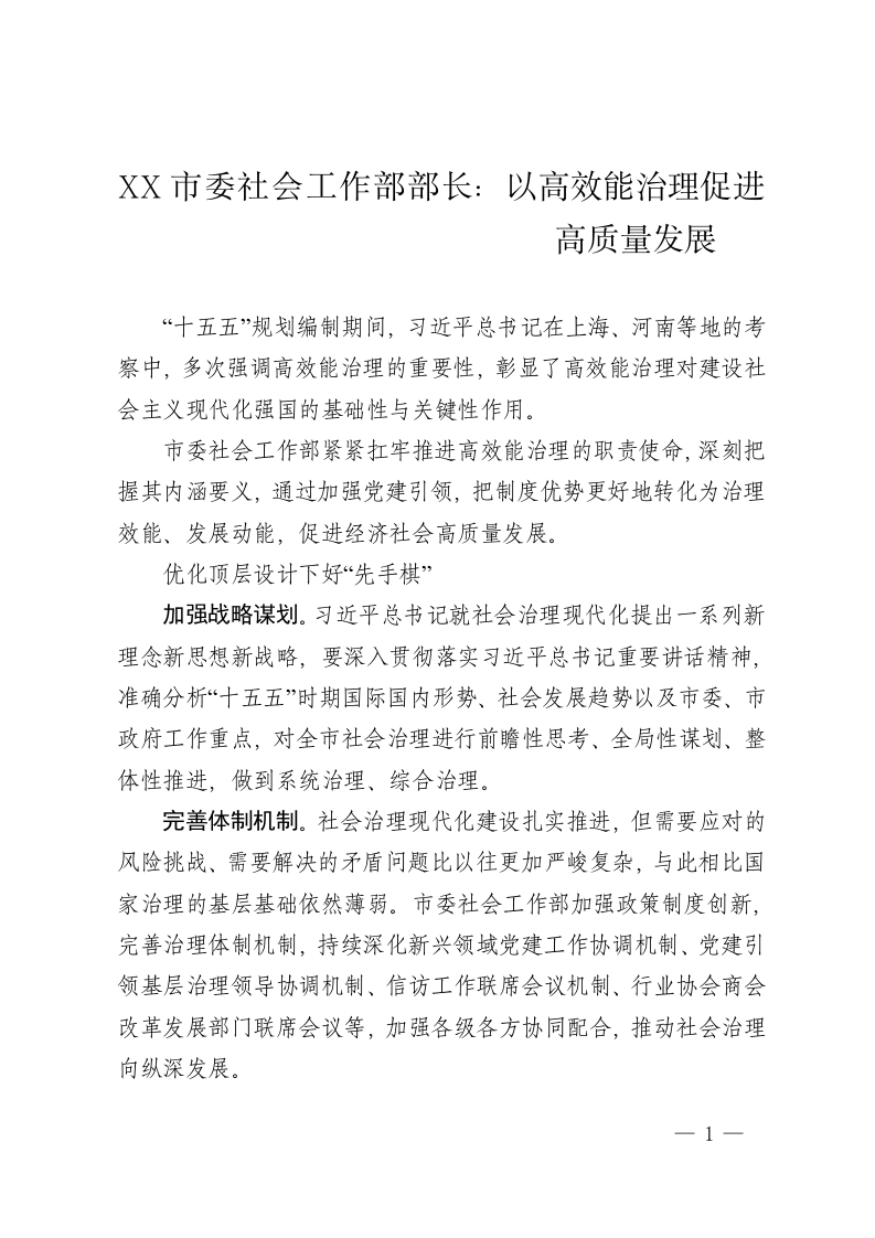 XX市委社会工作部部长:以高效能治理促进高质量发展