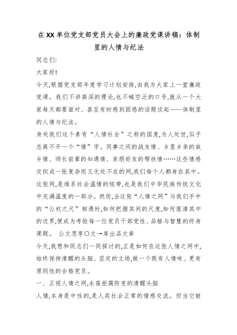 在XX单位党支部党员大会上的廉政党课讲稿:体制里的人情与纪法